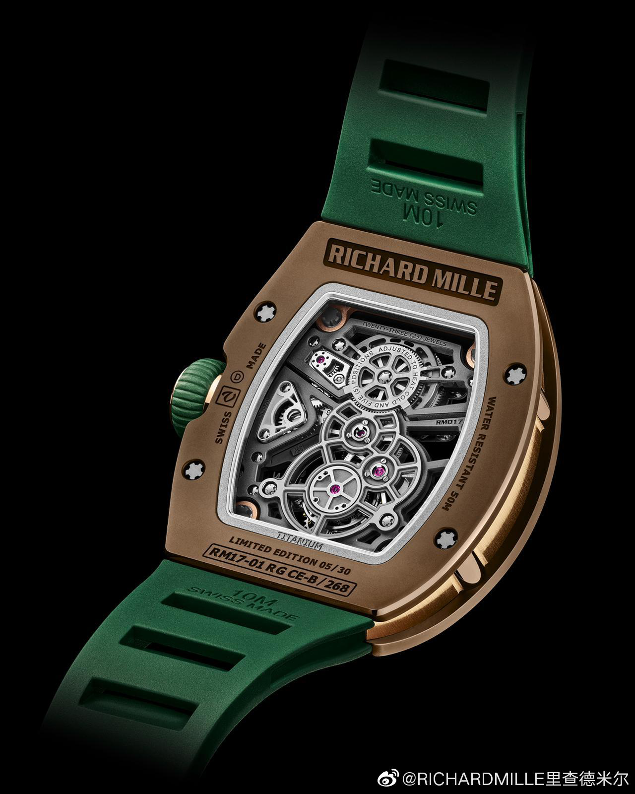 RICHARD MILLE推出全新RM 17-01棕色金属陶瓷(brown Cermet)歌颂春天。它的色调从陀飞轮机芯的内部与外部映衬出来,勾勒着大自然的万象更新。其金属陶瓷表壳散发着金属光泽的棕色光芒,与红金材质中层表壳搭配,闪耀悦人的温暖。