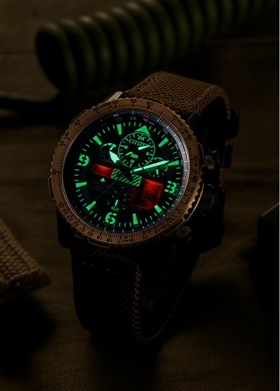 JY8074-11X新款腕表在外显的强悍气魄下内蕴雄图。45毫米大直径表盘搭配尼龙粗织表带,带来极强的存在感和男性力量感。深灰色哑光不锈钢表壳与玫瑰金色表圈的颜色碰撞,为腕表的醒目外观增添了平衡质感。蓝宝石玻璃表镜,坚硬耐磨,清晰可视。复杂功能表盘以森林绿色映衬夜光指针与刻度,在繁复之中给人以清爽平静和舒适深邃之感。指针和数显双模式设计,让腕表可以容纳更多强大功能。荧光绿色涂层和红色LED背光撞色设计带来强烈的视觉冲击力,在暗夜之中尽显张扬个性。
