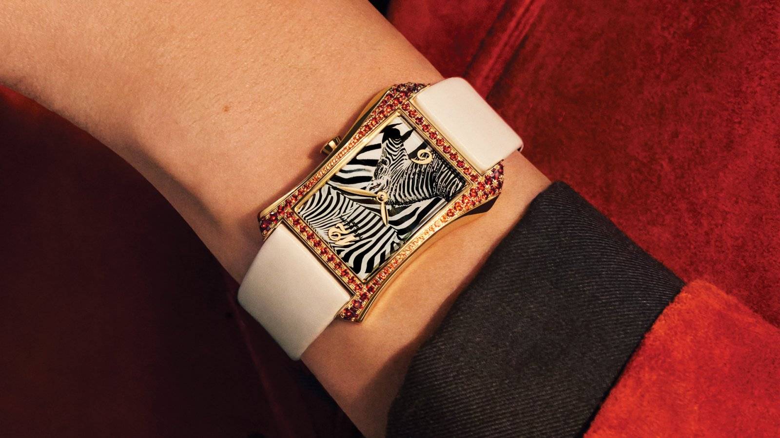玫瑰金表壳(28.6 x 40.85毫米)镶嵌94颗明亮式切割锰铝榴石(2.02克拉),呈现自“干邑色”(12时和6时位置)至“柑橘色”(9时和3时位置)的双色渐变效果。由深至浅、再由浅入深的色彩变化,搭配尺寸渐变的宝石,淋漓凸显腕表的优雅“收腰”弧形轮廓,亦使腕表丝滑贴合手腕线条。表壳下部镶嵌第二排锰铝榴石,辉映出不对称轮廓。